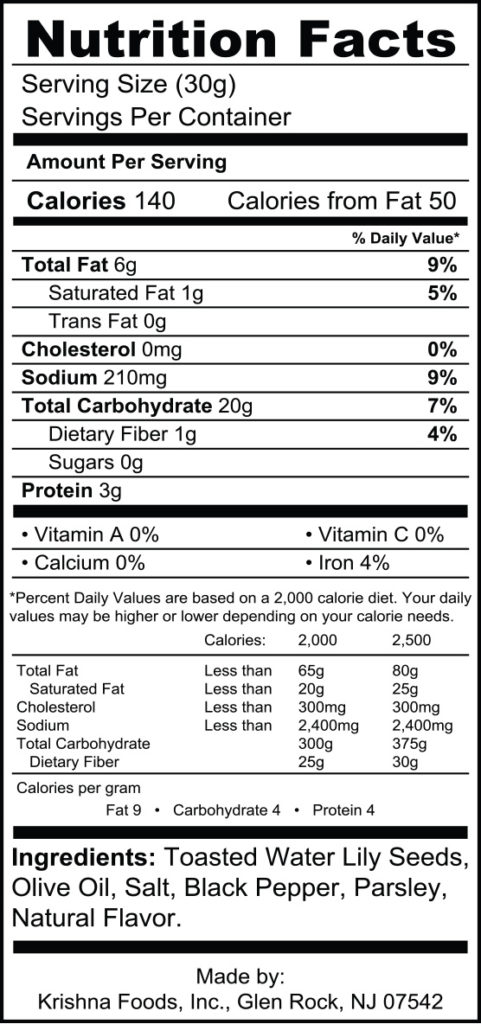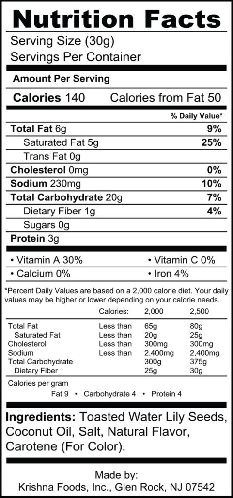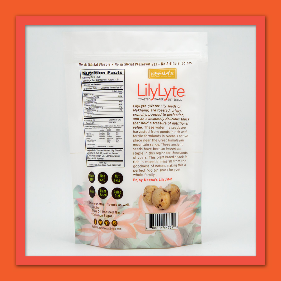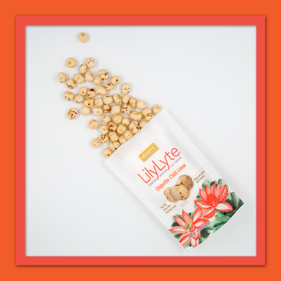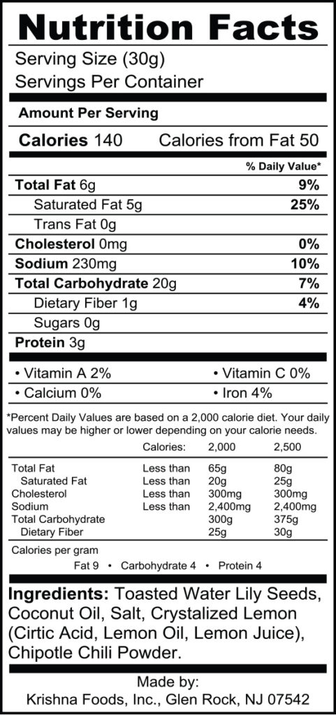 Toasted water lily seeds, coconut oil, salt, critic acid, lemon oil, lemon juice and chipotle chili powder.