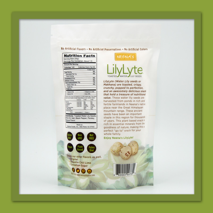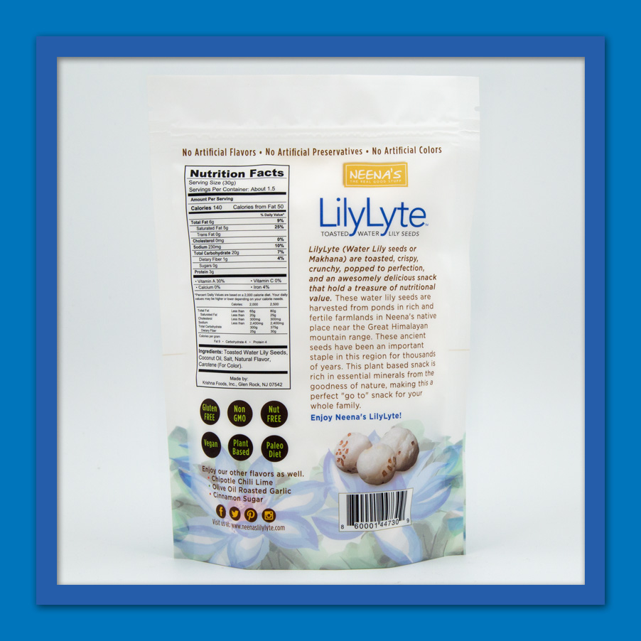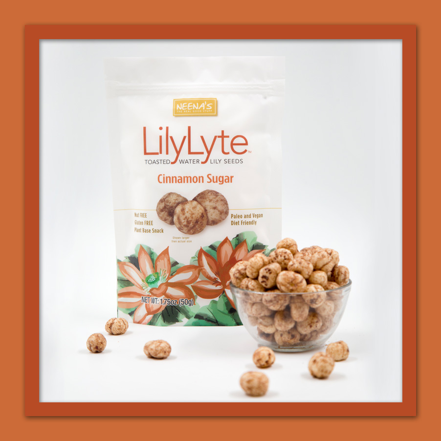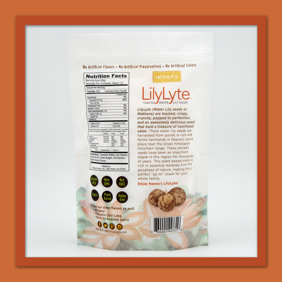 Toasted water lily seeds, coconut oil, salt, critic acid, lemon oil, lemon juice and chipotle chili powder.